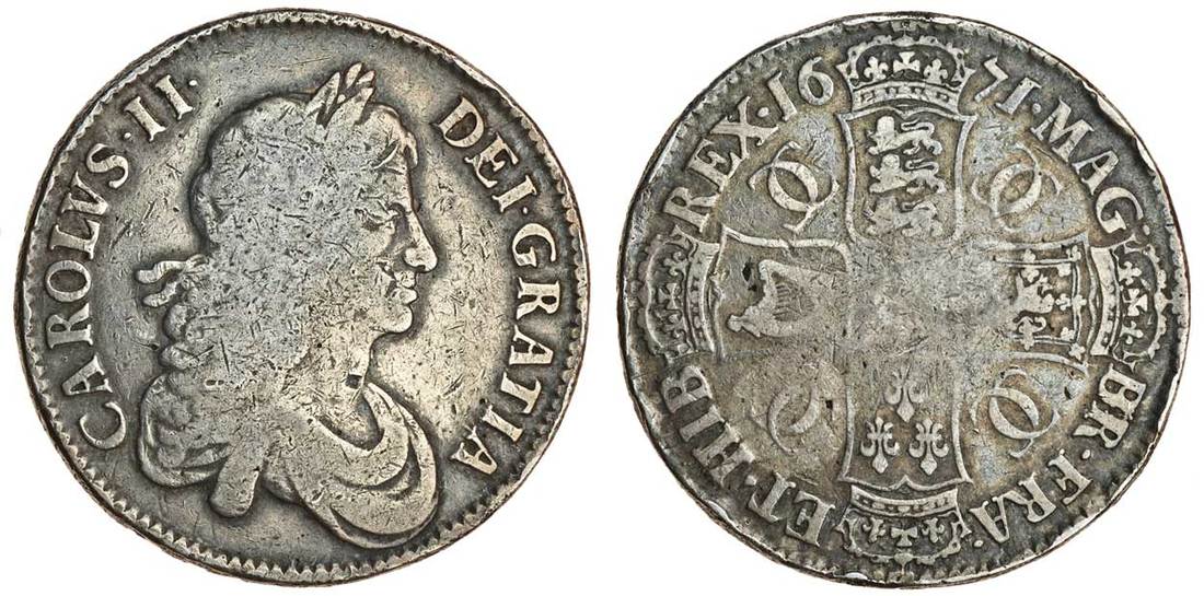 Charles II (1660-85), Crowns (2), 1671, v•tertio edge, second draped bust right, rev. crowned shields cruciform, interlinked Cs in angles, garter at centre, 1676, v•octavo edge, third draped bust, rev. as above (S.3357, 3358; ESC 382 (42), 397 (51)), the first has br cut over an uncertain character, near fine, the second very fine but with inclusions in the flan from poorly mixed alloy (2)