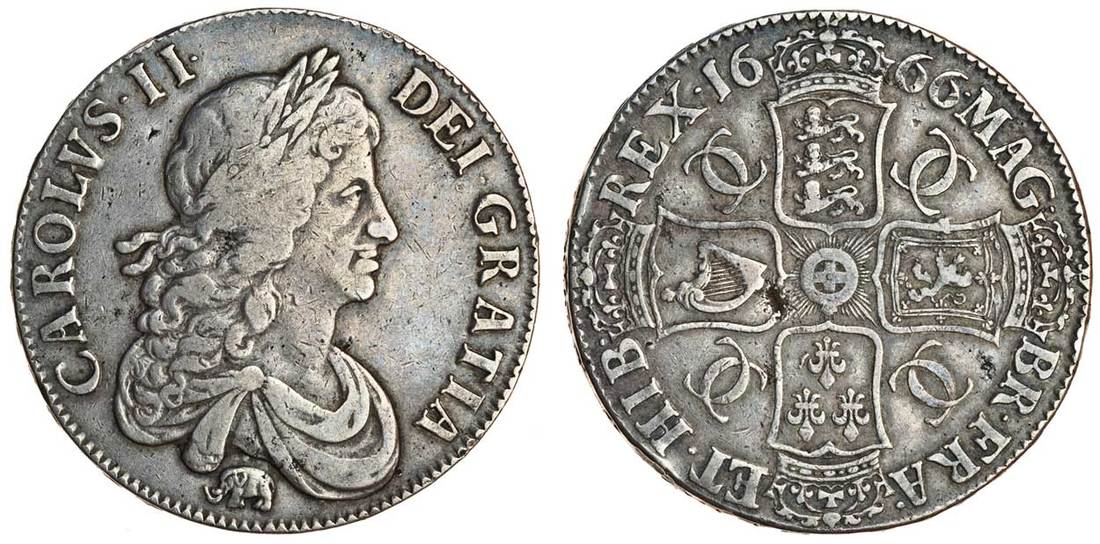 Charles II (1660-85), Crown, 1666, viii edge, second draped bust right, elephant below, rev. crowned shields cruciform, interlinked Cs in angles, garter at centre (S.3356; ESC 368 (33)), a small flaw on the reverse, good fine