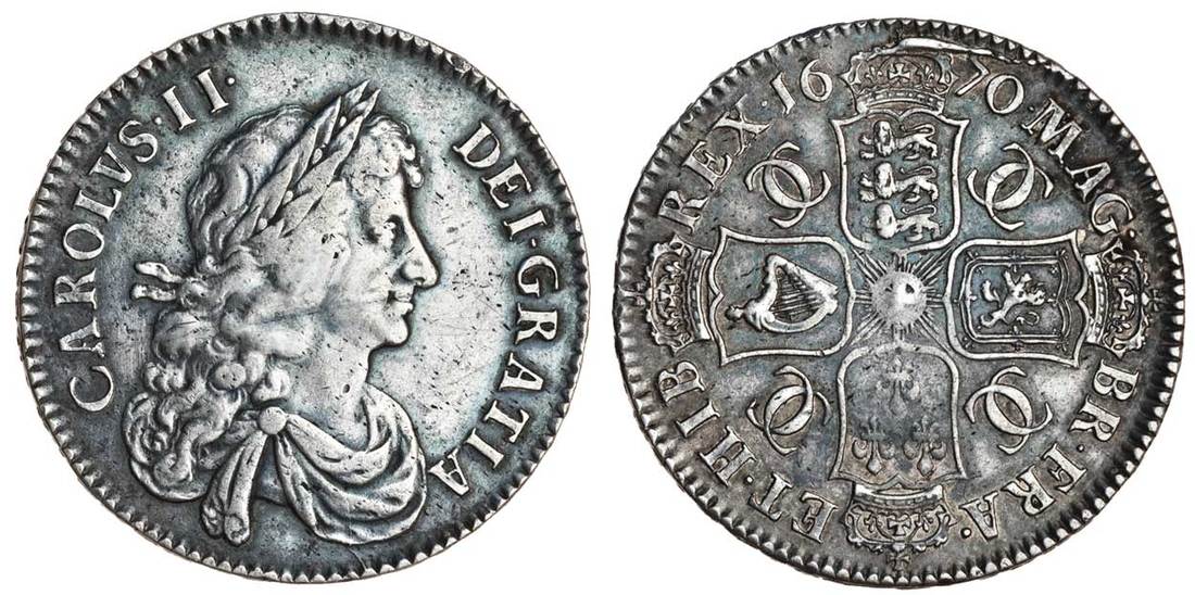 Charles II (1660-85), Halfcrown, 1670, v•secundo edge, third draped bust right, rev. crowned shields cruciform, interlinked Cs in angles, garter at centre (S.3365; ESC 453 (467)), toned, nearly very fine