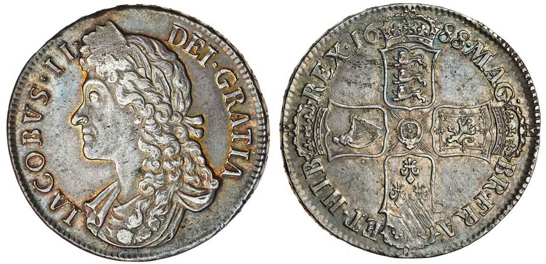 James II (1685-88), Crown, 1688/7, qvarto edge, second draped bust left, rev. crowned shields cruciform, plain angles, garter at centre (S.3407; ESC 747 (81)), adjustment marks to the hair and French crown, nearly good very fine with golden tones