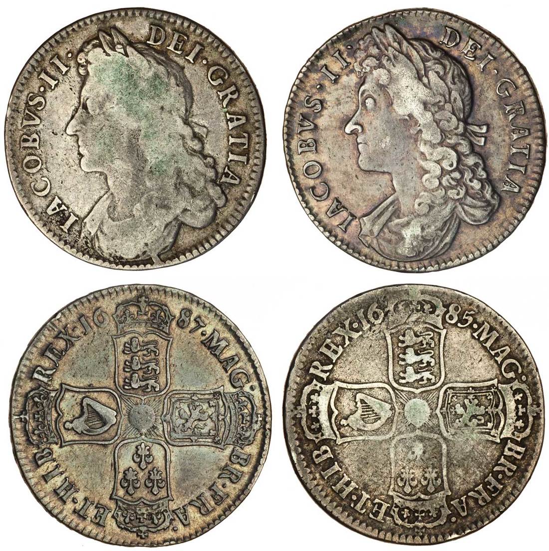 James II (1685-88), Halfcrowns (2), 1685, first bust, primo edge, 1687, second draped bust, rev. crowned shields cruciform, plain angles, garter at centre (S.3408, 3409; ESC 748 (393), 756 (500)), the first obverse legend with traces of undertype, possibly from a previous die, fair or better, the second toned, almost very fine (2)