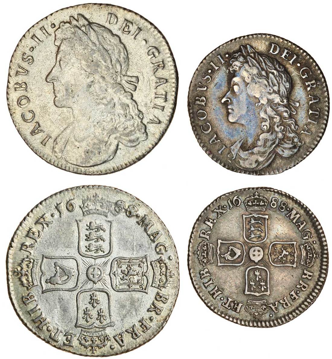 James II (1685-88), Shilling, 6.00g, 1688, draped bust left, rev. crowned shields cruciform, plain angles, garter at centre, Sixpence, 1688, rev. as above (S.3410, 3412; ESC 771 (1073), 780 (1528)), the first is high grade but appears to have been chemically cleaned with porous surfaces, this better than very fine, the second, toned, nearly very fine, with graffiti in one angle (2)
