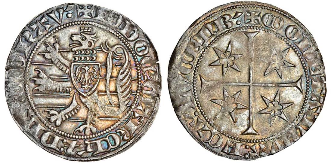 Luxembourg, Josse of Moravia (Second reign, 1407-10), Gros, 2.73g, +iodoe'. march'. z dns: morav'., shield on Lion of Luxembourg, rev. + moneta: nova: fca'. lvcenb'., cross, stars in angles (BV 175; de Mey 177; Serrure 152; Weiller 164), good very fine