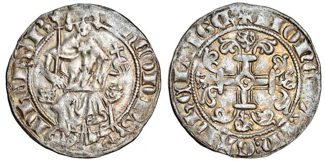 Germany, Heinsberg, Dietrich III (131-61), Gros, 2.04g, Gangelt, theo. dsdhensb, King seated on throne, rev. +moneta: in: ganhel sig cr, cross fleury, very fine, rare