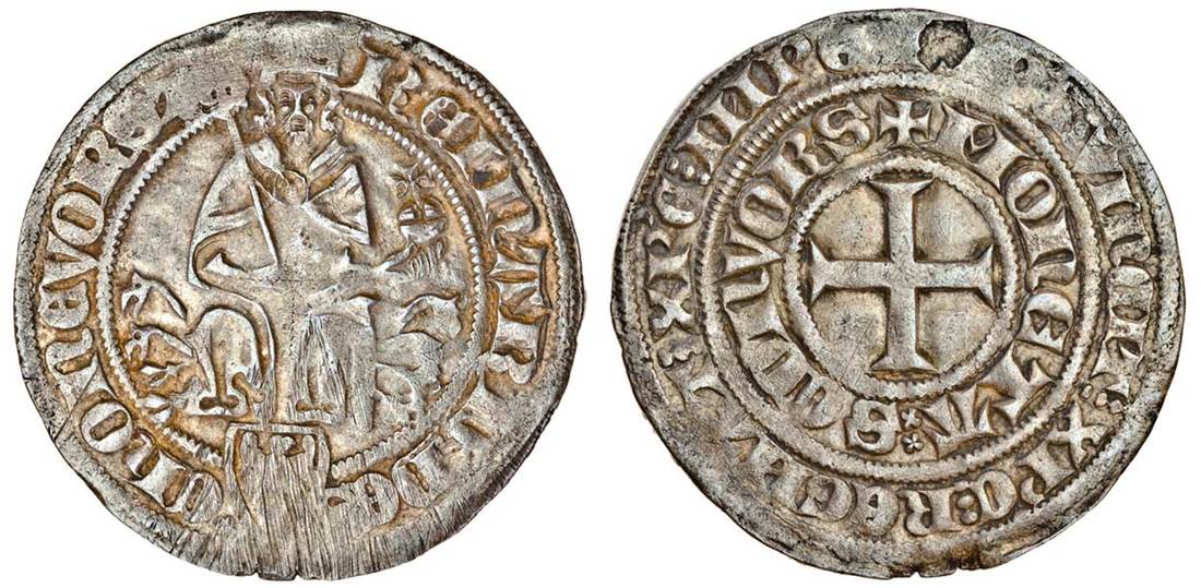 Germany, Schönforst, Reinhard I (1358-91), Double Schilling, 3.39g, reinard de s-chonevorst, King seated on throne, rev. [...] vincit: xpc: regnat: xp'c: inp g, in outer circle, +moneta: schonvorst, in inner circle, cross (Menadier 3a), scraped above and below the king and some flat areas in legend on reverse, elsewhere the detail very fine, rare