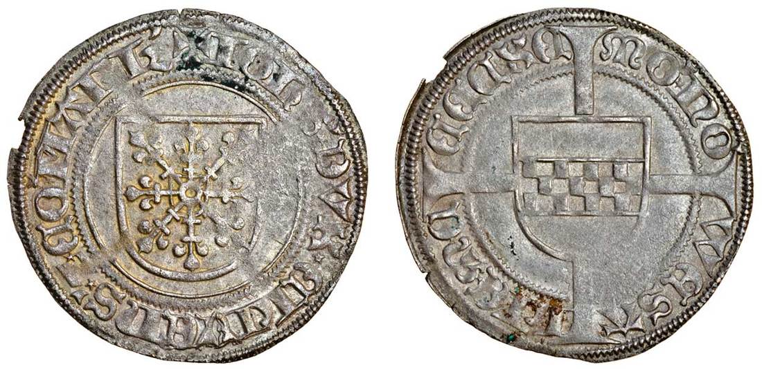 Germany, Kleve-Mark, Johann II (1481-1521), Stüber, 2.46g, 1490, Wesel, +iohs'. dvx. clivens'. z. co. mark, shield, rev. mo'. no' wesa-lie. mc-cccxc, shield over cross (Noss 163), some verdigris, edge chip between 9 and 10 o'clock, otherwise very fine