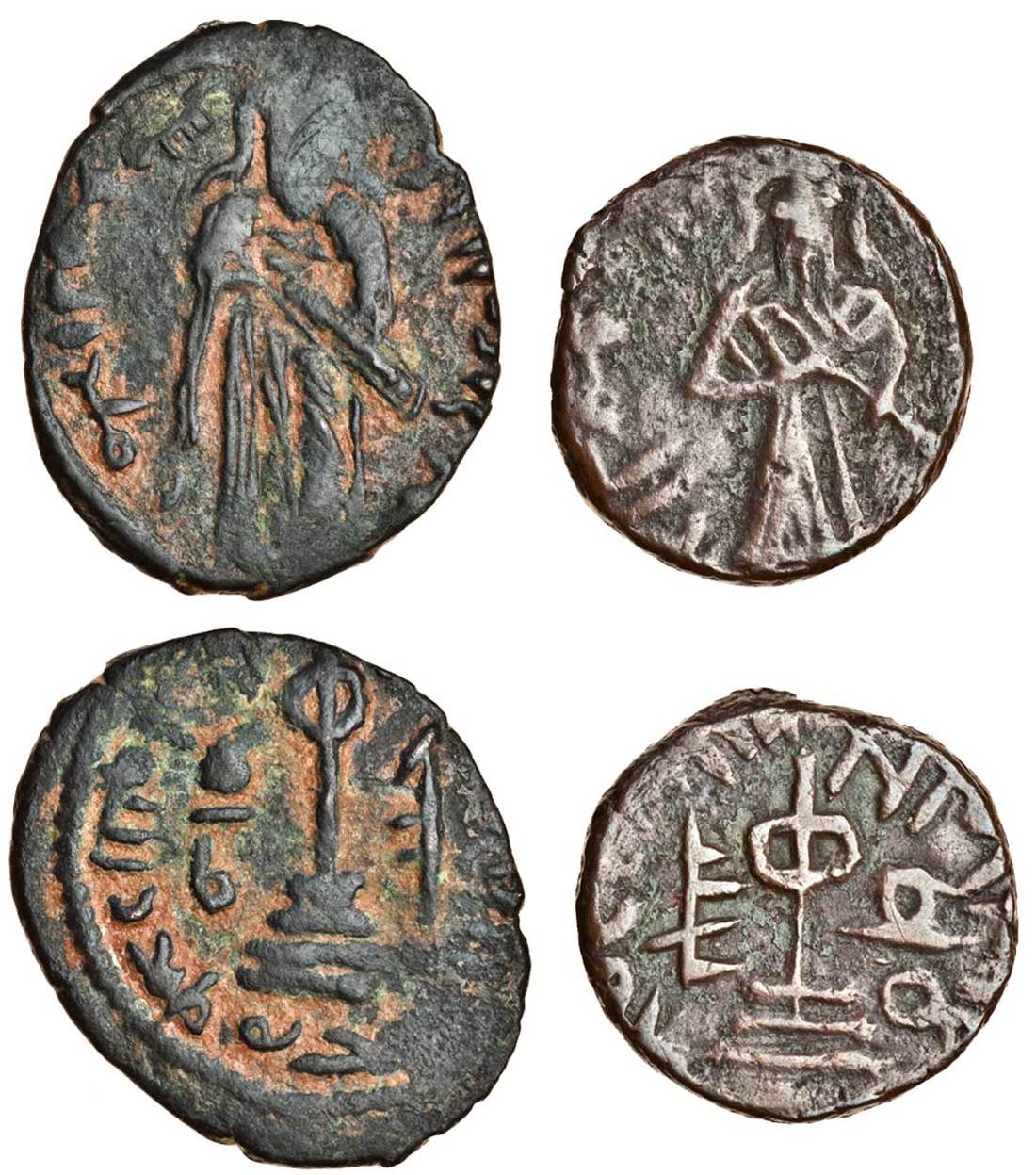 Arab-Byzantine, 'Abd al-Malik (c.AD 685-705), AE Fals, Aleppo, Caliph standing facing, hand on hilt of sword, rev. modified cross potent on three steps, Arabic legend and mint signature (cf. BMC 108), almost very fine , and another similar (cf. BMC 114), good fine