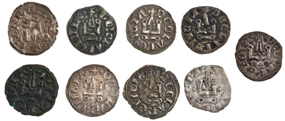 Achaia,, billon Deniers Tournois (9), of William of Villehardouin, Charles II of Anjou, Florent of Hainaut, Isabelle of Villehardouin, (2), Philip of Savoy, Philip of Taranto, Louis of Burgundy, and Ferdinand of Majorca, fine to very fine, identified with tickets (9)