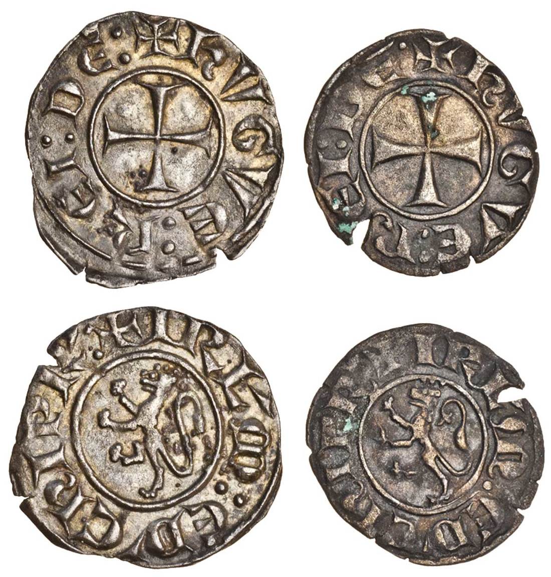 Cyprus, Hugh III (1267-84), Deniers (2), 0.59g and 0.75g, cross, rev. lion of Cyprus rampant left (Metcalf 484; Schl. VI, 26), both with traces of verdigris and minor edge chips, very fine or better (2)