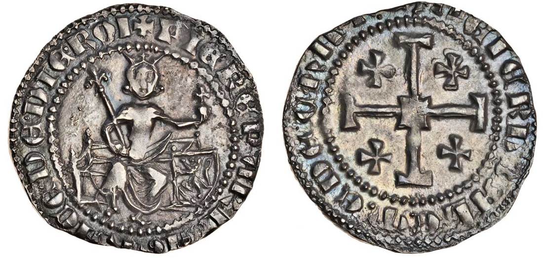 Cyprus, Peter II (1369-82), Gros, 4.53g, wide throne issue, Famagusta, +piere par la grace. de. die. roi, King seated on throne facing, rev. +de ierusalem e de chip[re], reversed u, Jerusalem cross (Metcalf 792; Schl VII, 4), very fine