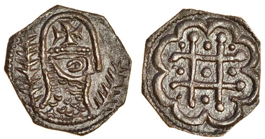 Antioch, anonymous AE fractional Denier, 0.60g (temp. Bohemund III, 1163-80), helmeted head right between branches, rev. grid with nine pellets in octafoil (Met.481; Schl. III, 16), extremely fine
