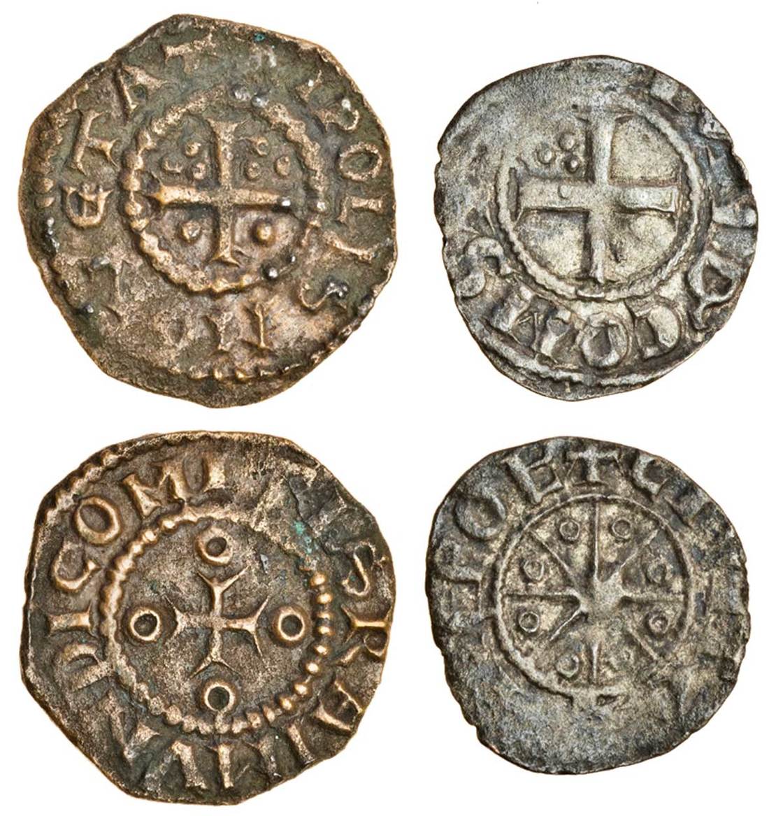 Tripoli, AE Deniers (4), of Raymond I-III (c.1100-87), and Bohemond IV or V (c.1187-1251), all different types, smal cross patée and four annulets, rev. cross with dots in angles (Met.505), cross, rev. horse, or Agnus Dei (Met.506), cross, rev. star and crescent (Met.508-512), and star and crescent, rev. cross with intersecting cross (Met.518), very fine (4)