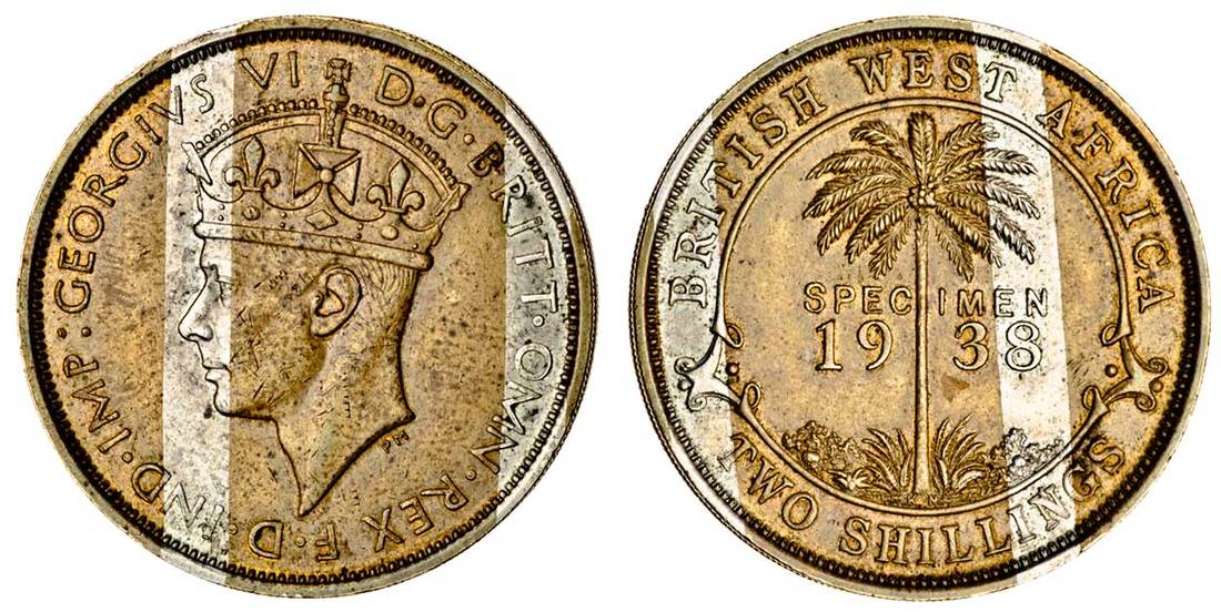 British West Africa, George VI (1936-53), brass pattern 2-Shillings, 1938 KN, crowned head left, rev. palm tree dividing specimen above date, with white metal strip both sides (KM Pn.10; Vice 310), some light spotting, good very fine, vey rare
