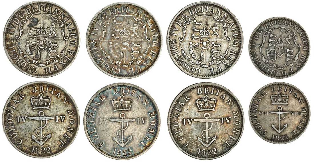 British West Indies, George IV (1820-30), anchor money (4), 1/4-Dollar (3), 1/8-Dollar, all 1822 (KM 3, 2), very fine (4)
