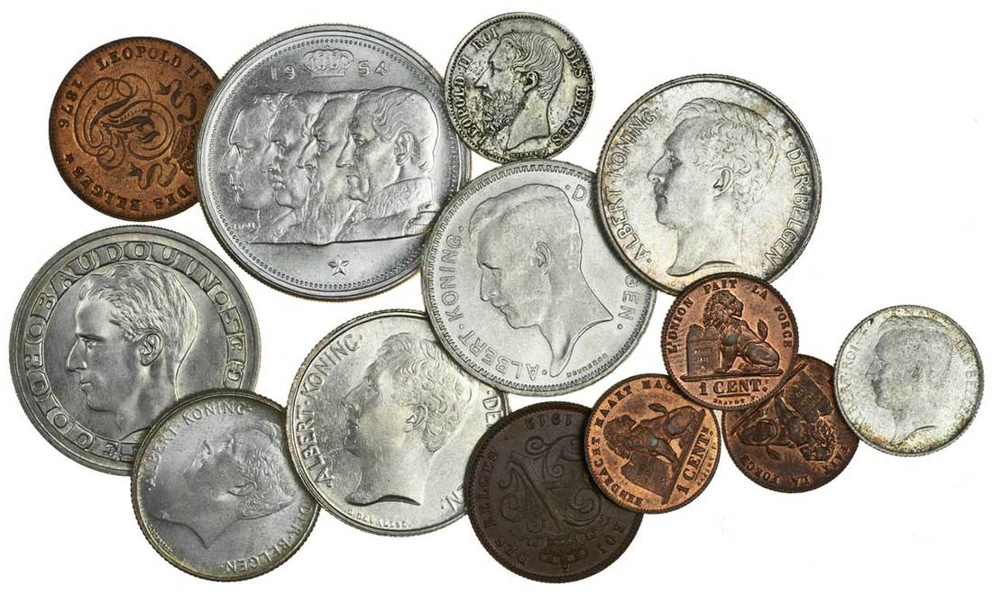 Belgium, 100-Franks, 1954, 50-Franks, 1958, 20-Franks, 1934, 2-Franks (2), 1911, 1912, 1-Frank, 1914, 50-Centimes (2), 1866, 1912, AE 2-Centimes (2), 1876, 1912, 1-Centime (3), 1887, 1901, 1912 (KM. 26, 33.2, 34.1, 35.1, 64, 70, 73.1, 75, 76, 104.1, 138.1, 150.1), very fine to extremely fine or better (13)