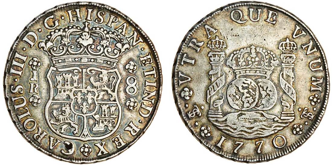 Bolivia, Charles III (1759-88), 8-Reales, 1770, Potosi, crowned shield, stop after carolus, rev. crowned pillars and globes (Cal.972; KM 50), indentation in cc of caolus, good very fine