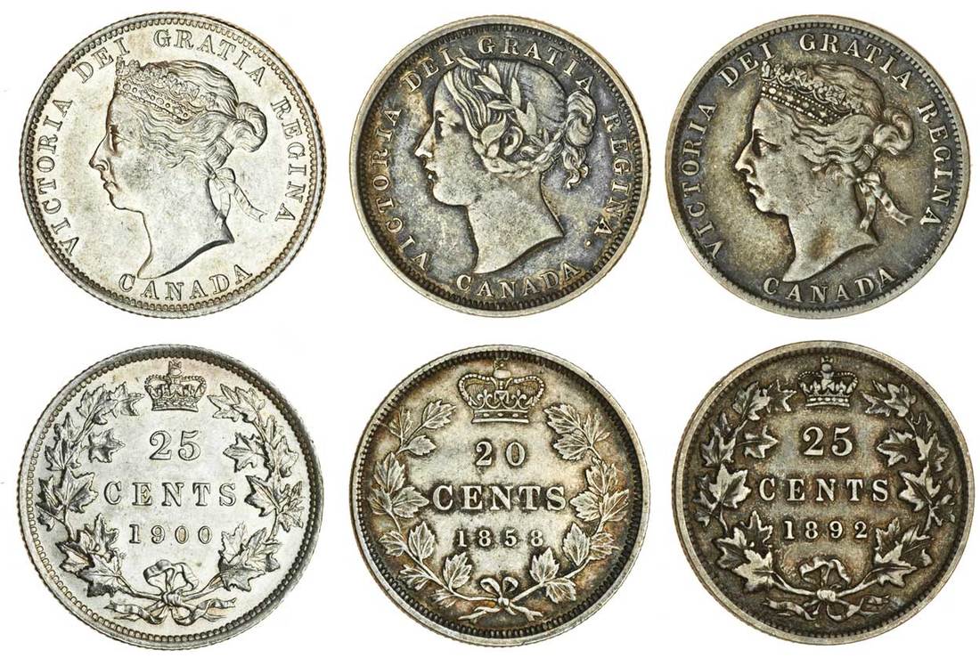 Canada, Victoria (1837-1901), 20-Cents, 1858, 25-Cents (2), 1892, 1900, head left, rev. value and date in wreath, crown above (KM 4, 5), first two very fine, last extremely fine (3)