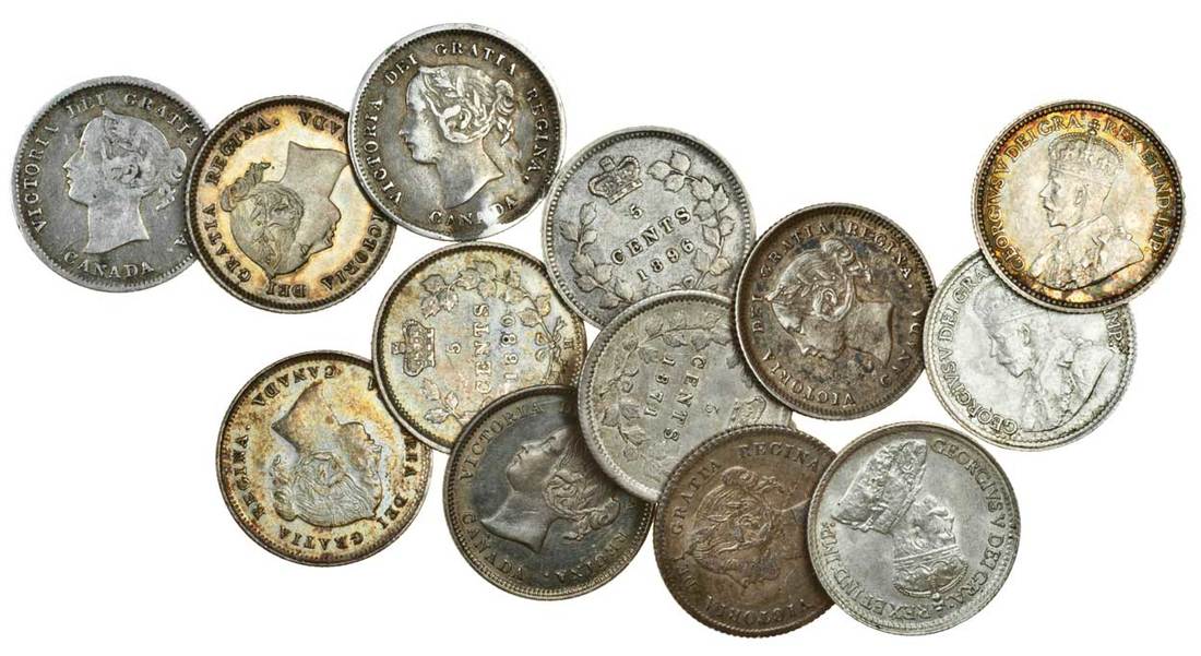 Canada, 5-Cents (13), 1871 (2), 1872, 1874H, plain 4, 1880H, 1881H, 1882H, 1892, 1896, 1900 (oval 0), 1912, 1919 (2) (KM 2, 7, 22), mostly very fine or better (13)