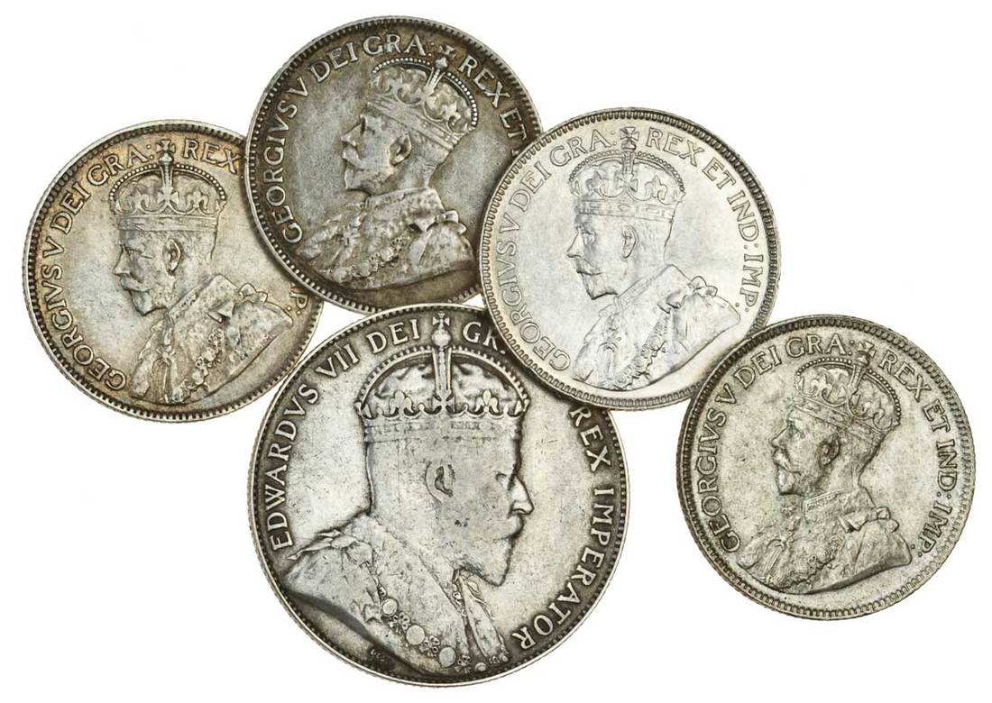 Canada, Edward VII (1901-10), 50-Cents, 1910, Edwardian leaves (KM 12a), about very fine, George V (1910-36), 25-Cents (4), 1918, 1919 (2), 1930 (KM 5, 24, 24a), very fine, one 1919 extremely fine (5)