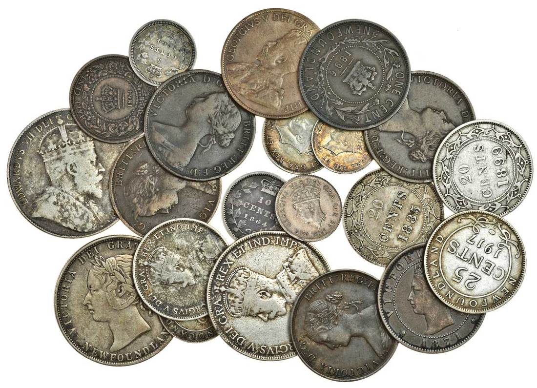 Canada, New Brunswick, 10-Cents, 1864, 5-Cents, 1864 large 6 (KM 8 and 7), good fine, Newfoundland, silver coins (11), 50-Cents (3), 1894, 1904H, 1917C, 25-Cents, 1917C , 20-Cents (3), 1885, 1899, 1912, 10-Cents (2), 1917C, 1942C, 5-Cents (2), both 1941C, and provincial bronze coins (8) (KM 1, 4, 6, 8.2, 11, 12, 14, 15, 16, 17), mixed condition, average very fine (21)