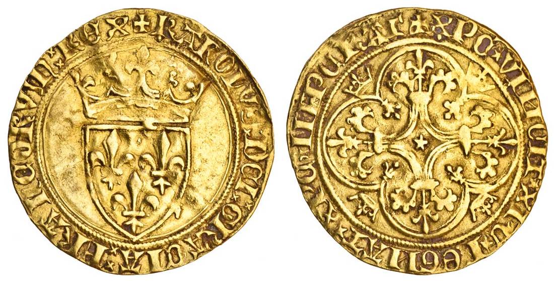 France, Charles VI (1380-1422), Écu d'or à la couronne, 3.90g, Crémieu, crowned shield, rev. cross in quadrilobe (Dup.369; F.291), from a mount, good fine