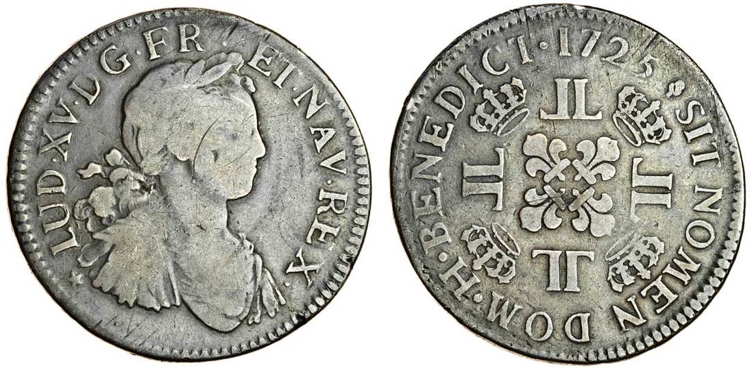 France, Louis XV (1715-74), Écu, 1725H, La Rochelle, young bust right, rev. four cowns and eight Ls cruciform (Gad.320; KM 472.9), very good, very rare, the wear is from many years of honest circulation and this example is not from the group salvaged from the wreck of the Chameau and so it is without the corrosion that is usually seen on these La Rochelle coins