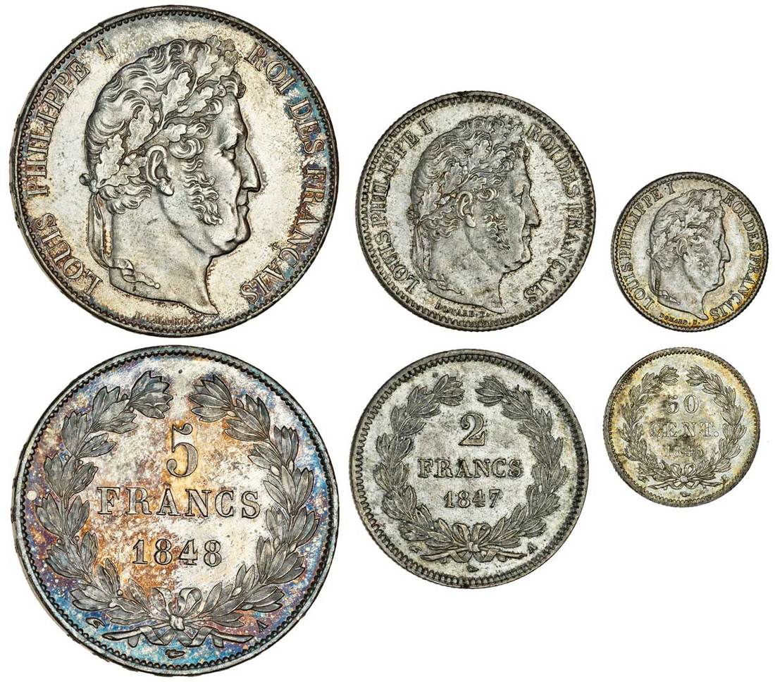 France, Louis Philippe I (1830-48), 5-Francs, 1848A, Paris (KM 749.1), 2-Francs, 1847A, Paris (KM 743.1), 50-Centimes, 1846B (KM 768.2), extremely fine, with lustre (3)