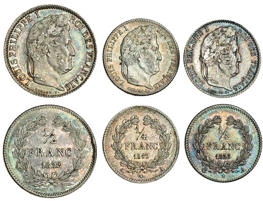 France, Louis Philippe (1830-48), Half-Franc, 1832A, laureate head right, rev. value in wreath, Quarter-Franc (2), 1833A, 1843A (KM 740.1, 741.1), toned and with some lustre, extremely fine (3)