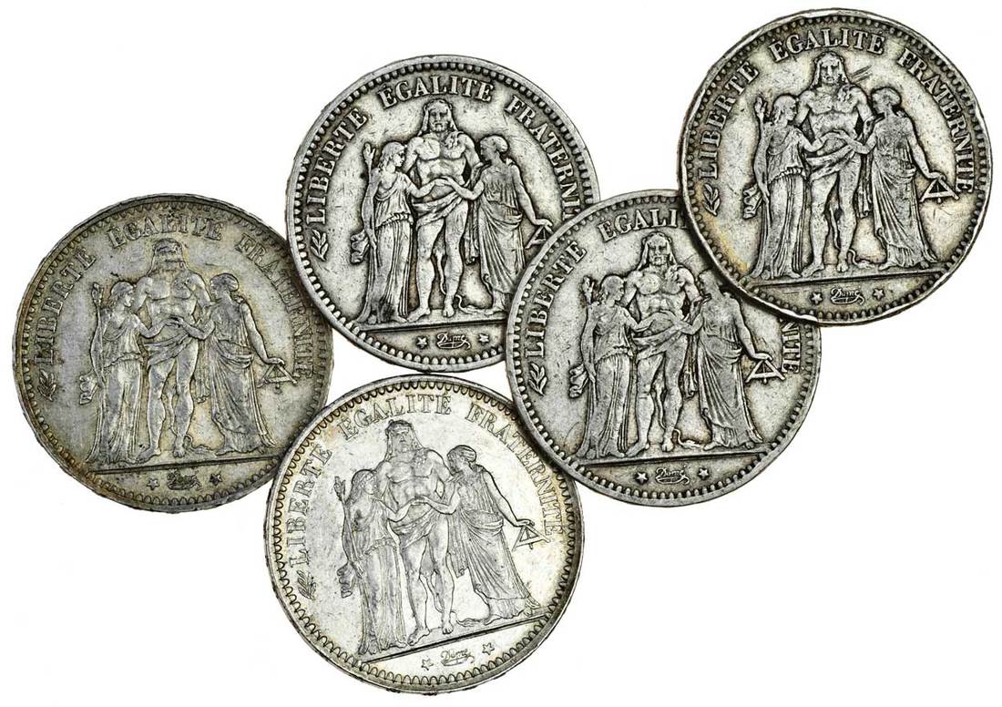 France, Third Republic (1871-1940), 5-Francs (5), 1871K, 1873A, 1875A, 1875K, 1877K (KM 820.1, 820.2), first good fine, scarce, second extremely fine, third very fine, others fine (5)