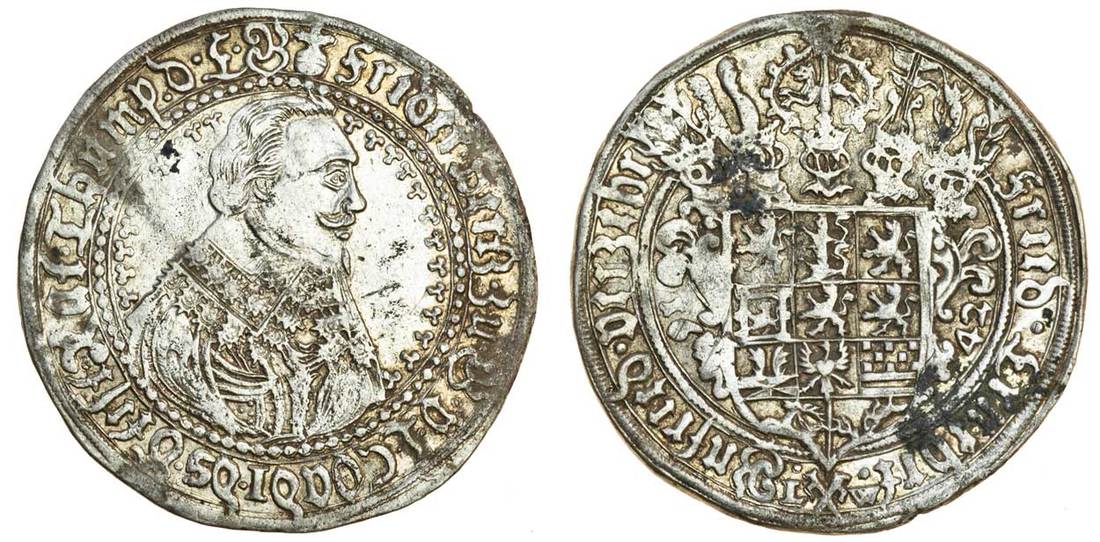 Germany, Brunswick-Luneburg-Celle, Friedrich V (1636-48), Half-Taler, 1642, half-length bust right, rev. complex shield with five helms (KM 143; Welter 1419), some verdigris and other surface damage, otherwise very fine