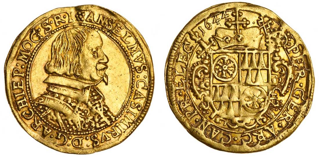 Germany, Mainz, Anselm Kasimir von Umstadt (1629-47), Ducat, 3.43g, 1644, bust right, rev. cap over shield in cartouche (Pr. Alexander 421; F.1647), slight crease, good very fine
