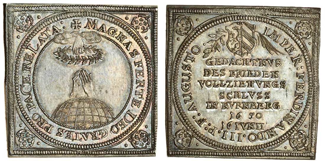 Germany, Nurnberg, silver medal, 1650, on the Ratification of the Peace of Münster by the Emperor Ferdinand III, 16 June 1650, a klippe of Quarter-Taler weight, hand from clouds holding a wreath above praying hands on a globe, rev. shield above legend, 7.87g (Erlanger 527; Pax in Nummis 154), old cabinet tone, extremely fine