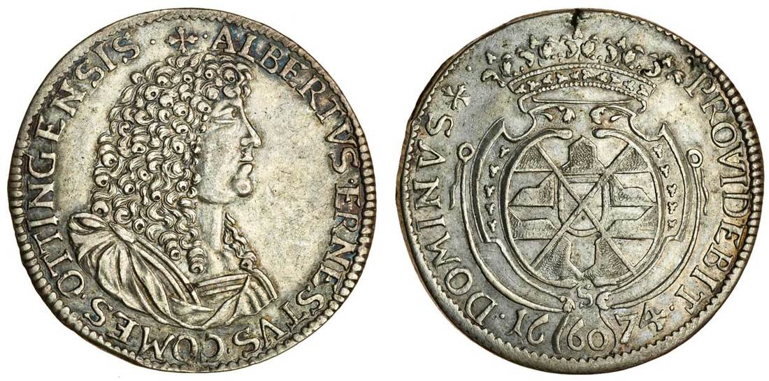 Germany, Ottingen, Albert Ernst (1659-83), Gulden of 60-Kreuzer, 1674, bust right, rev. crowned shield, S below, for mintmaster Schattauer (Löffelh 304; Dav.736), very fine, scarce