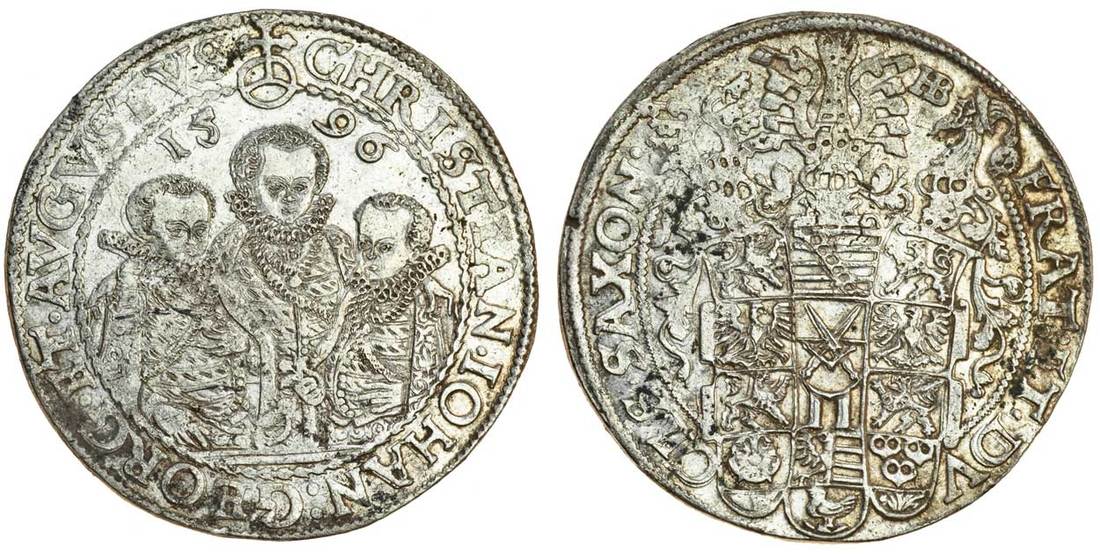 Germany, Saxony, Albertine line, Christian II, Johann Georg and August (1573-1605), Taler, 1596, the three brothers, rev. complex shield of arms (Dav.9820), cleaned, very fine
