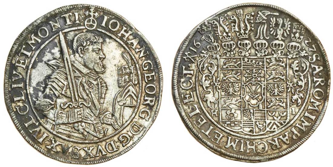 Germany, Saxony, Johann Georg (1615-56), Taler, 1627, armoured half-length figure right, holding sword and helmet, rev. comples shield, with six helms, dividing h-i (Dav.7601; KM 132), blackened in places, very fine