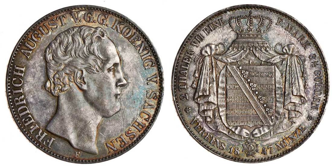 Germany, Saxony, Friedrich August II (1836-54), 2-Taler, 1847 f, head right, rev. arms with crowned mantle (Dav.874; KM 1149), extremely fine, old tone on lustrous surfaces