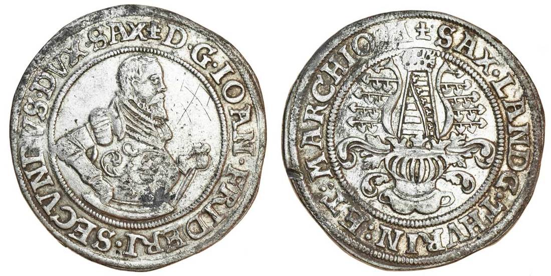 Germany, Saxe-Ernestine, Johann Friedrich II (1557-67), Half-Taler, Saalfeld, armoured half-length right, rev. helm, excavated, a spot of verdegris on obverse and some other surface deposit, otherwise very fine or better, rare