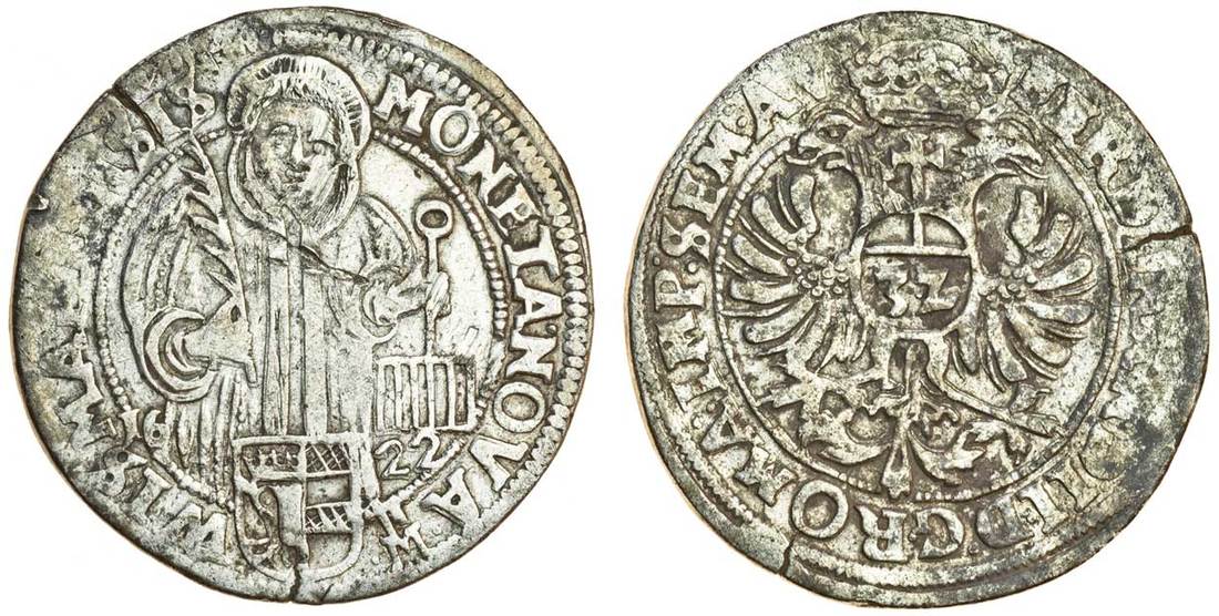 Germany, Wismar, city coinage in the name of Ferdinand II, Taler, 1622, of 32 Schilling, Saint Lawrence standing, rev. value on Imperial eagle (Dav.5939; KM 57), scratched on obverse when excavated, good fine, scarce