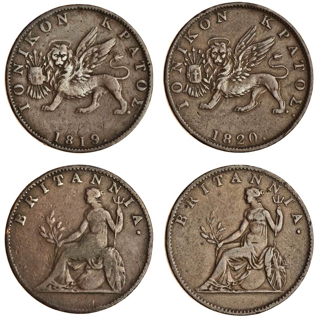 Greece, Ionian Islands, George III (1760-1820), copper Half-Obol or 2-Lepta (2), 1819, 1820, lion of St Mark above date, rev. Britannia seated left (KM 31; Pr.20, 21), fine and good fine (2)
