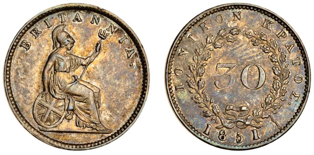Greece, Ionian Islands, William IV (1830-37), 30-Lepta, 1851, Britannia seated right, rev. value in wreath, no stop after date (KM 35; Pr.14), lightly toned, extremely fine