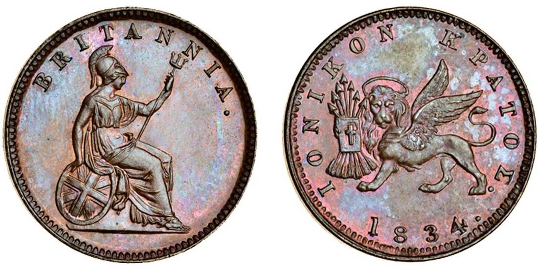 Greece, Ionian Islands, William IV (1830-37), copper proof Lepton or Fifth-Obol, 1834, Britannia seated right, rev., upright die axis, lion to left, stop after date (KM 34; Pr.23A), extremely fine, with some lustre