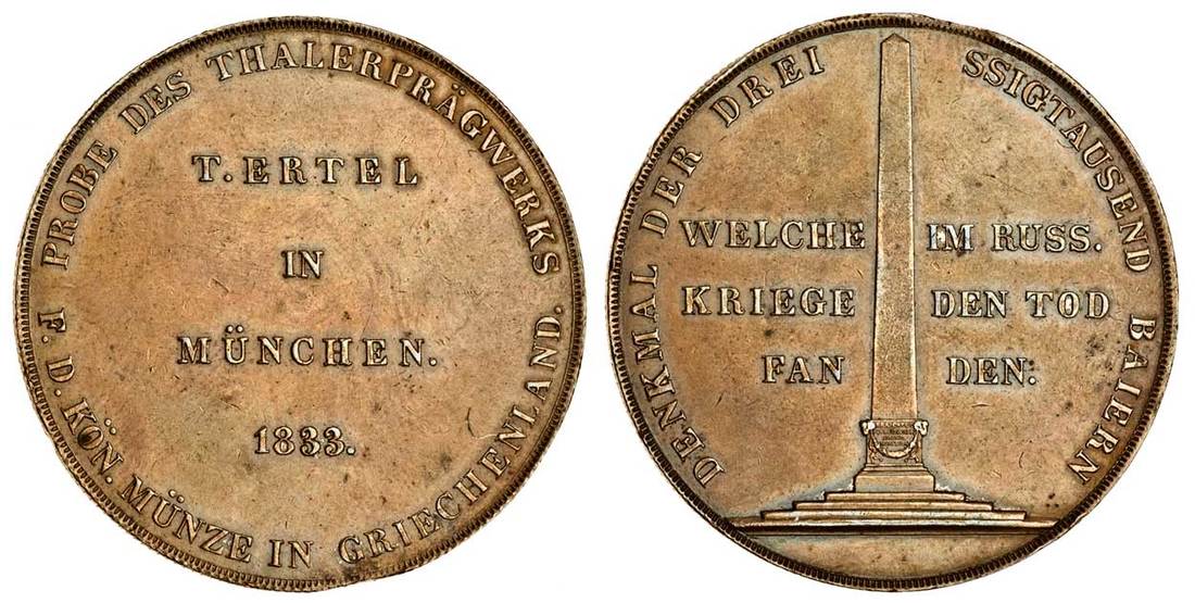 Greece, Otho (1832-62), Pattern copper 5-Drachmai, 1833, Ertel trial piece, Munich, legend, rev. monument, reeded edge (Divo P37-RRR), some marks on edge and reeding incomplete between 5 and 6 o'clock, good very fine, rare