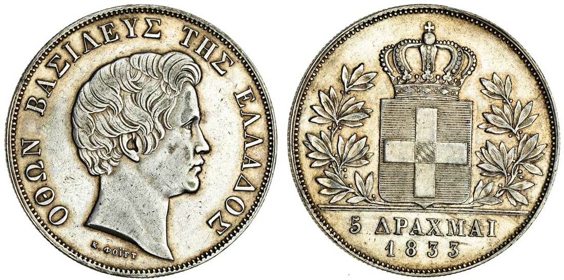 Greece, Otho (1832-62), 5-Drachmai, 1833, silver, young head right, engraver's name below truncation, rev. crowned arms, value and date below (Divo 10a; KM 20), cleaned, good very fine