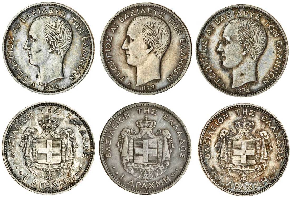 Greece, George I (1863-1913), Drachma (3), 1873A (2), 1874A, young head left, rev. crowned arms, value below (Divo 53b-c; KM 38), very fine and better (3)