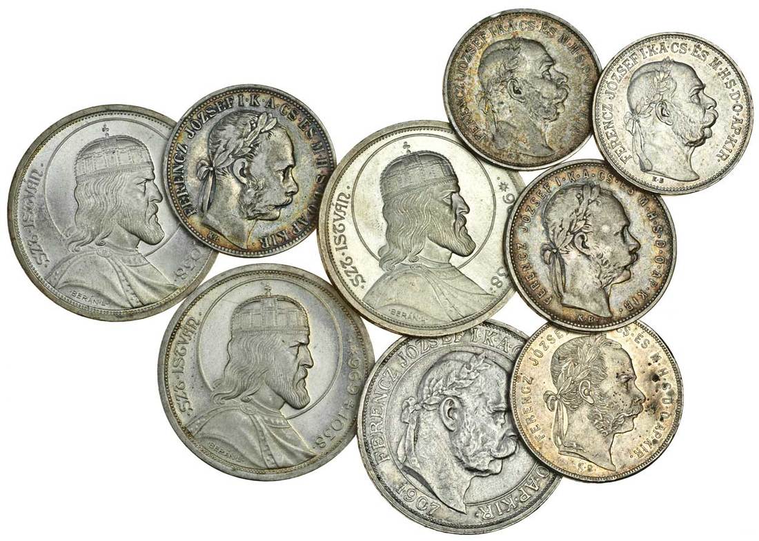 Hungary, Franz Joseph (1848-1916), silver coins (9), Forint (3), 1873KB, 1881KB, 1891KB (KM 453.1, 465, 475), 5-Korona 1907 (KM 489), 2-Korona (2), 1912 (KM 493), very fine and better, and 5-Pengo, 1938 (3), extremely fine (9)
