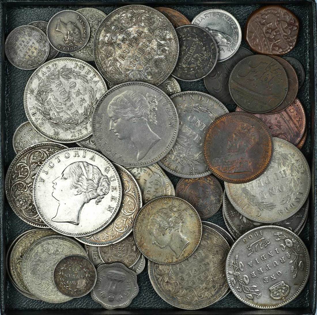 India, East India Company, Bombay Presidency, AE dump Pice, crown / legend, Madras Presidency, Double-Fanam, undated (1808), AE 10-Cash, 1808 (2), 5-Cash, 1803 (3), British India, Rupees (14), 1835 (2), 1840 (5), 1862 (2), 1877, 1878, 1879, 1888, 1905, 1/2-Rupees (5), 1840, 1888, 1914, 1942, 1944, 1/4-Rupee (5), 1835, 1919, 1942, 1943, 1947, 2-Annas (8), 1841 (4), 1862, 1904, 1917, 1940, other minor Coins (8), fine to extremely fine (47)