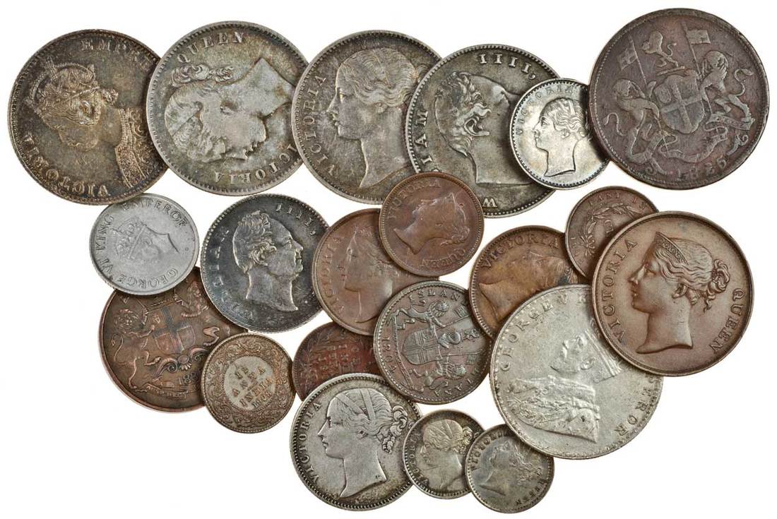 India, East India Company, miscellaneous coins, AR (11), AE (10), including, India, William IV, Rupee, ½-Rupee, AE ¼-Anna, 1835, Victoria, Rupees (3), 1840 (2), 1901, ½-, ¼-Rupee, 1840, 2-Annas (2), 1841, later Coins (3), Penang, AE 2-Cents, 1825, Straits Settlements, AE Cent, ½-Cents (2), ¼-Cents (2), all 1845, ¼-Cent, 1862, Singapore, AE Keping, merchant's token, AR coins generally very fine or better, AE coins fine to good very fine (21)
