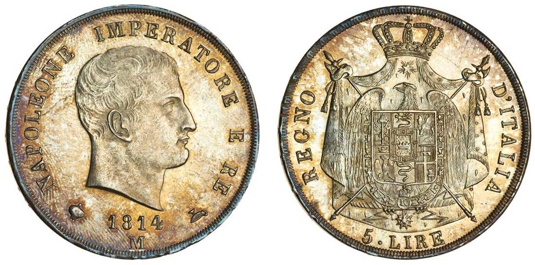Italy, Kingdom of Napoleon I (1804-14), 5-Lire, 1814 M, Milan, head right, rev. shield on eagle within crowned mantle, ountali sagomati (KM 10.4; Mont.231; P.32a), some cabinet friction and some light cabinet toning, lustrous and uncirculated, rare thus