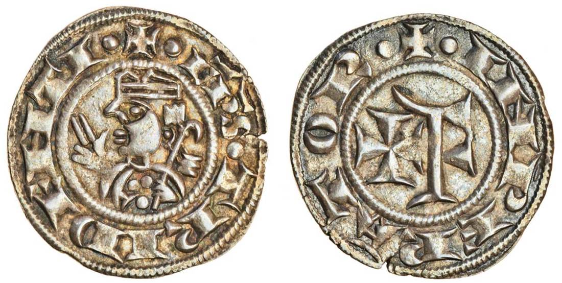 Italy, Trento, Bishopric, Friderich von Wangen (1207-18), Grosso, 1.67g, under Frederick Barbarossa, +eps tridenti, crowned bust left, rev. +. inperator., cross and f in field , small edge chip at 3 o'clock, very fine