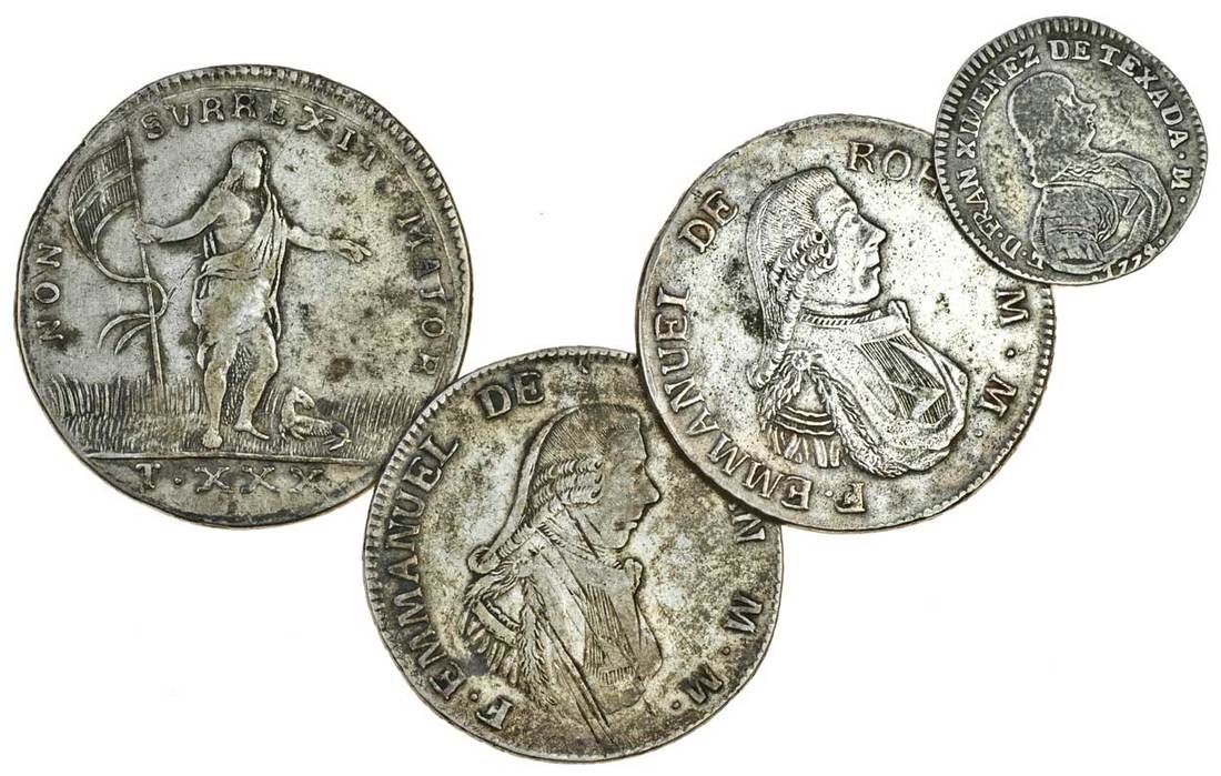 Malta, Emmanuel Pinto (1741-73), 30-Tari, 1761 (KM a256), Fransisco Ximenez de Texada (1773-75), 4-Tari, 1774 (KM 285), Emmanuel de Rohan (1775-97), 2-Scudi (2), both 1796, bust right, rev. crowned oval shield, date above (KM 343), about very fine (4)